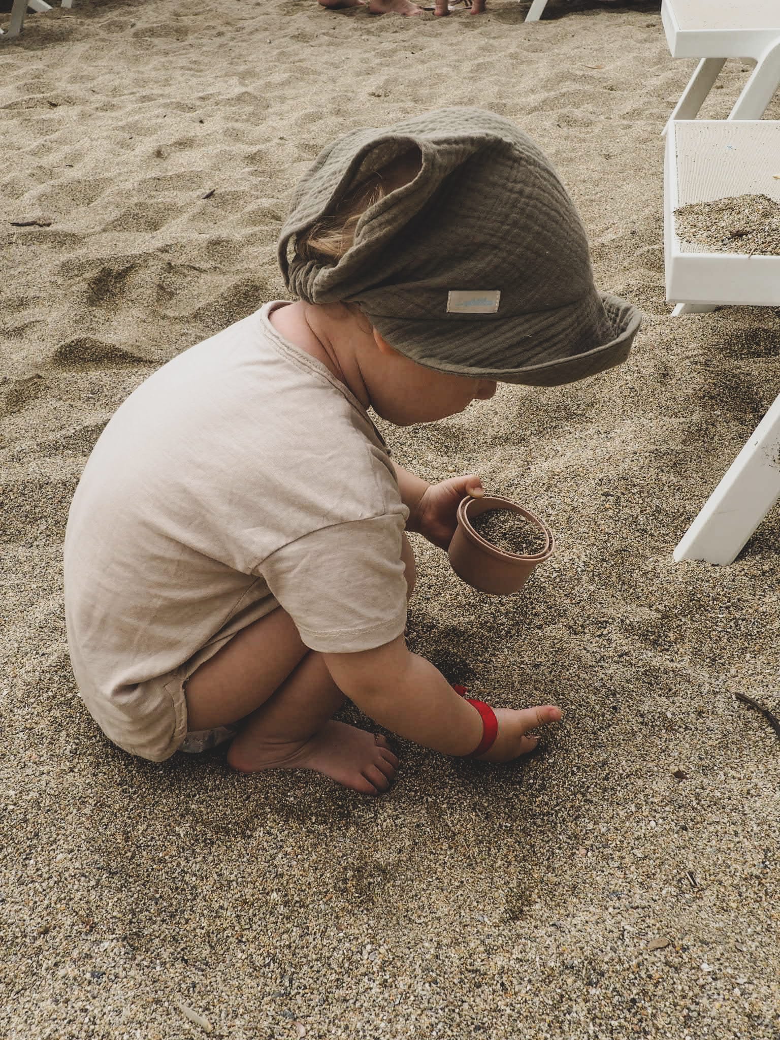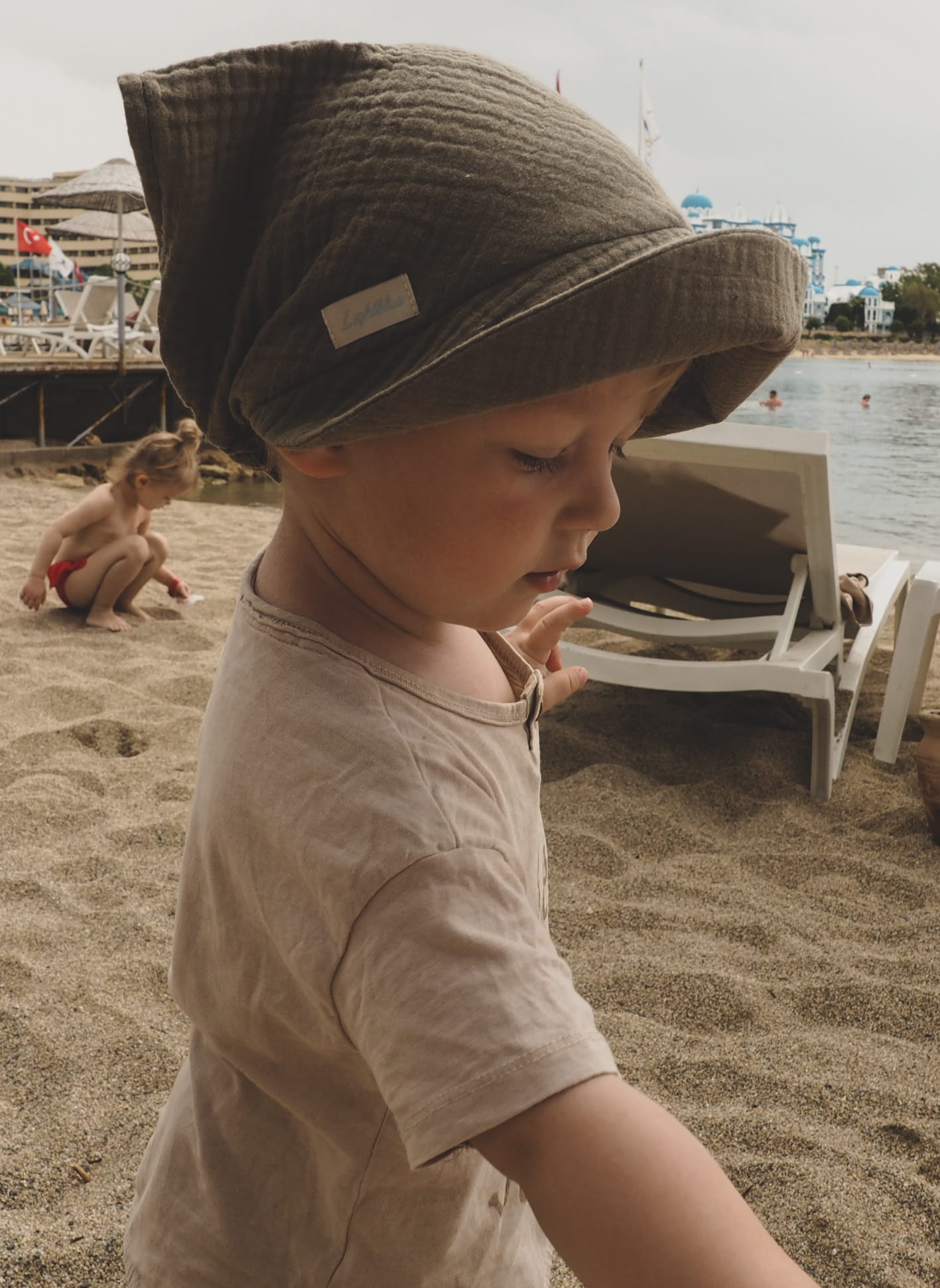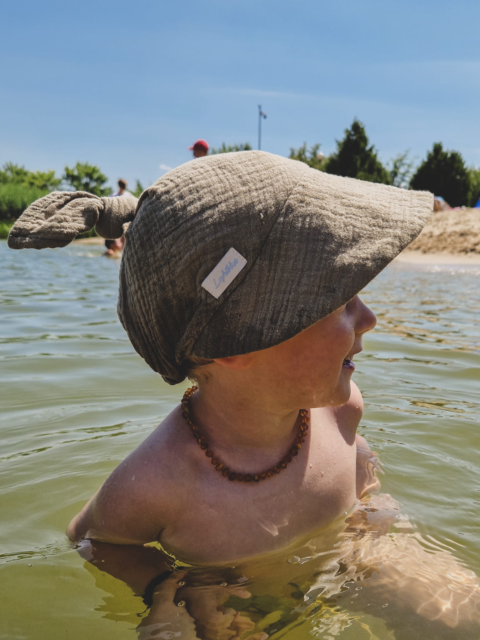 Daszek chustki jest dość szeroki, dzięki czemu osłania od słońca całą buźkę dziecka i po założeniu wygląda jak półkapelusik, co jest bardzo praktyczne, a do tego ślicznie się prezentuje.
