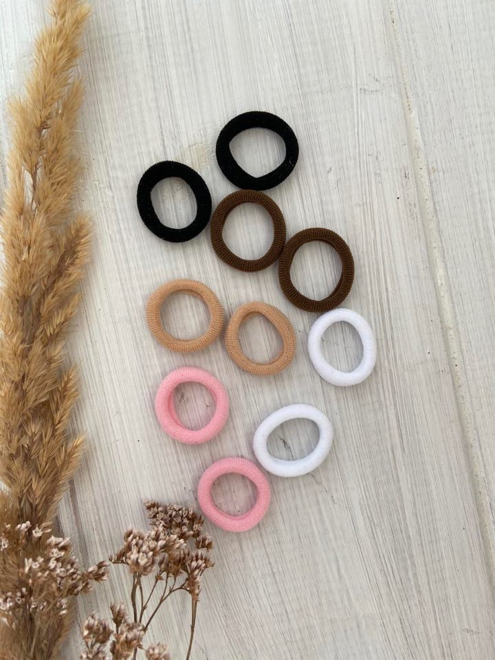 W zestawie 10 gumek - 2 różowe, 2 czarne, 2 karmelowe, 2 bladożółte, 2 białe.