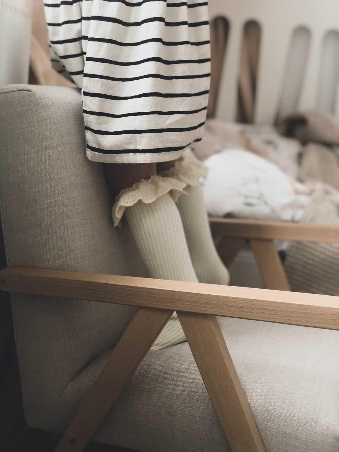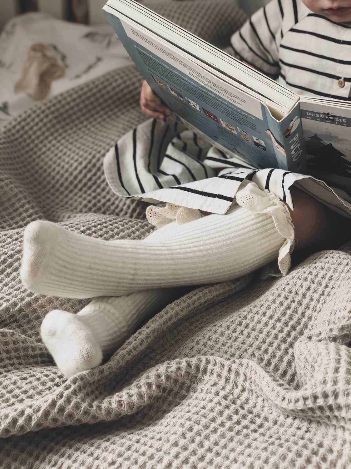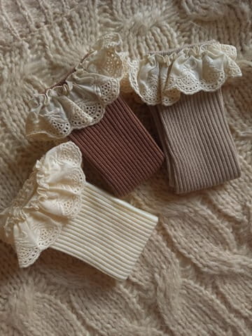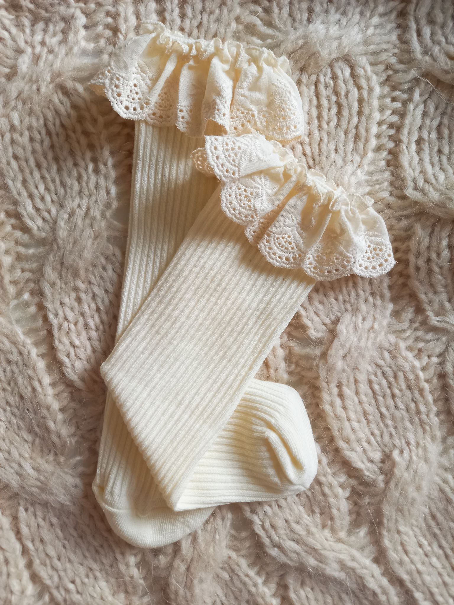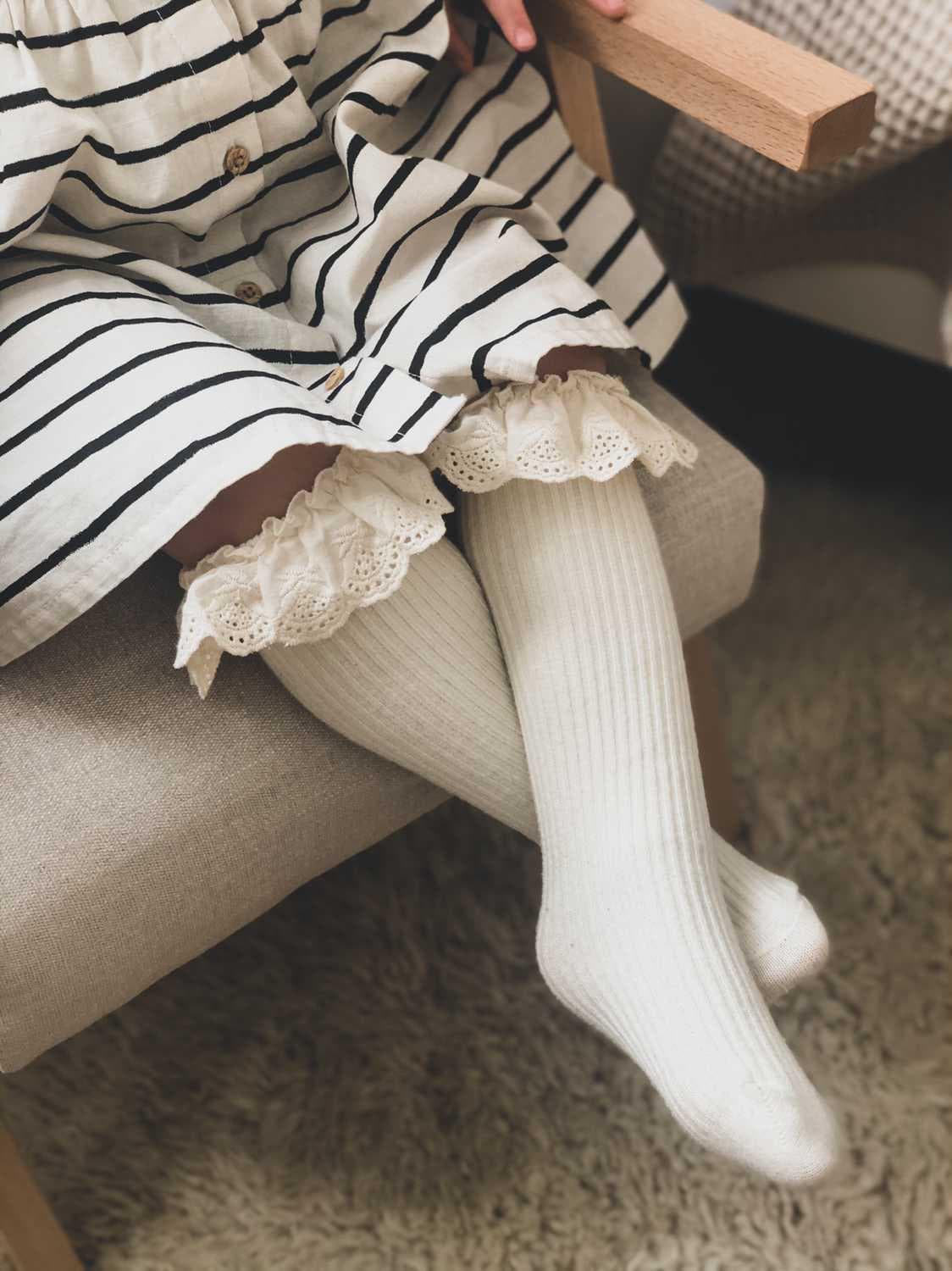 Podkolanówki prążkowane wykończone kremową, bawełnianą koronką.